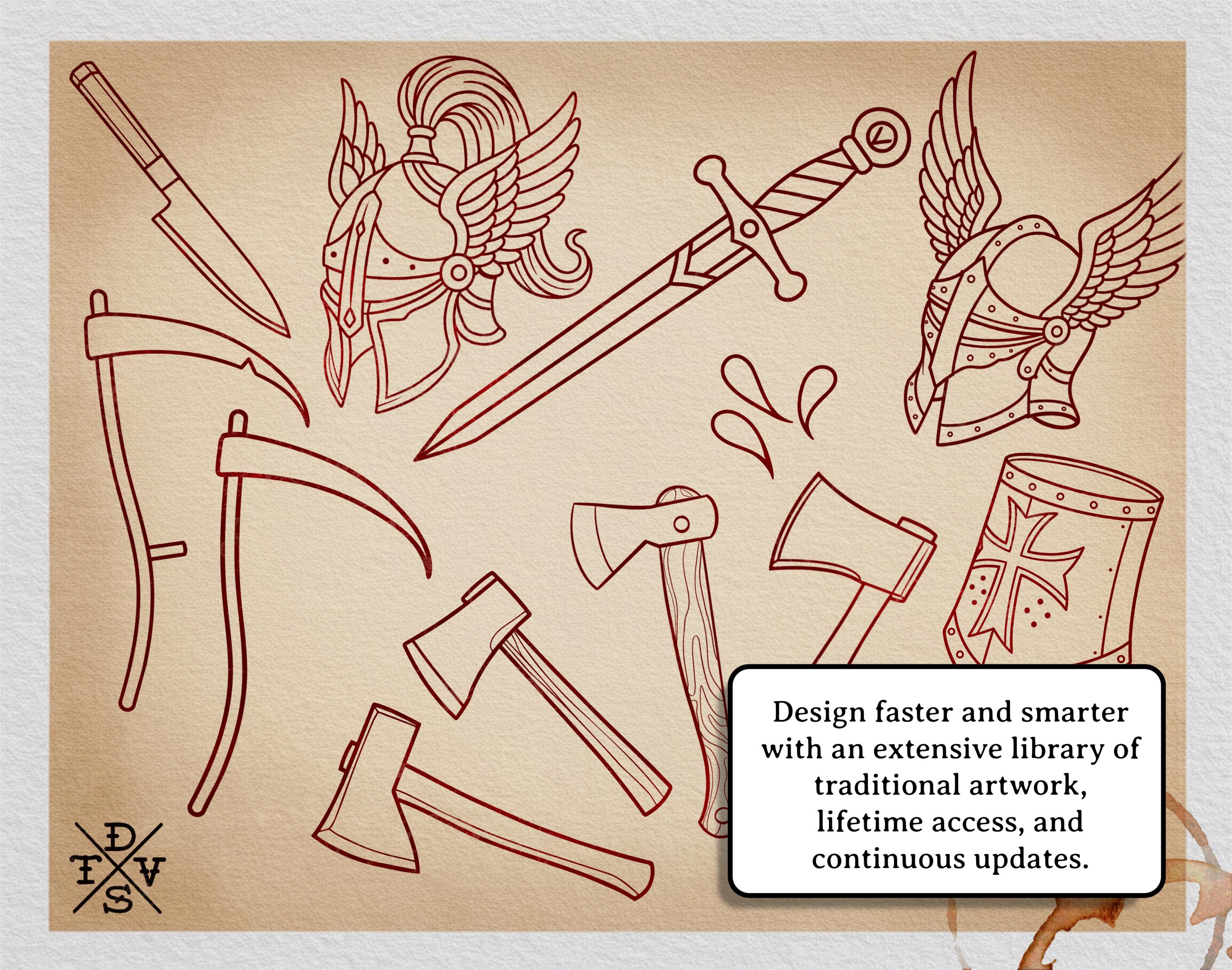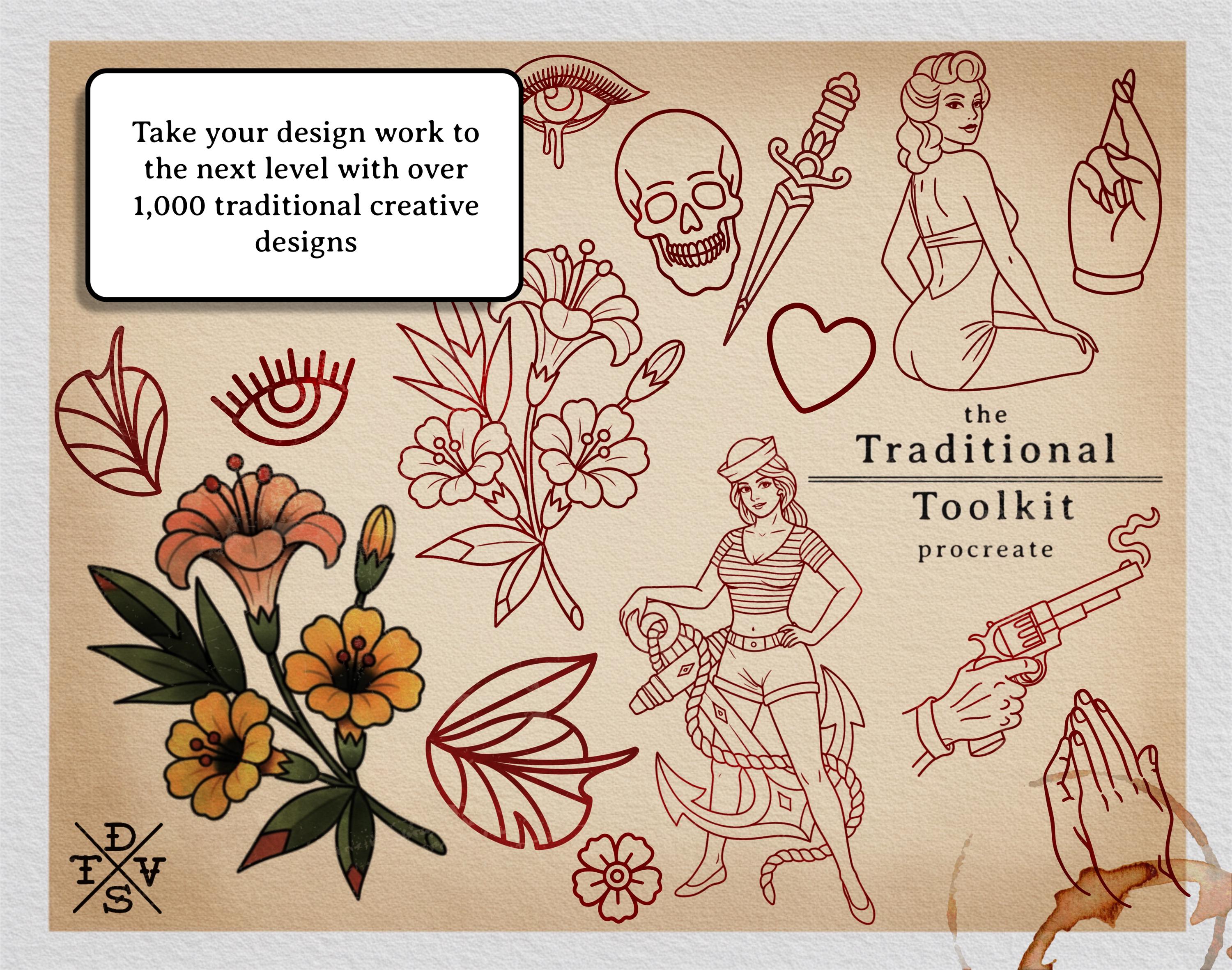 The Traditional Tattoo Toolkit is a digital Procreate toolkit made for artists who want to create their own traditional tattoo art with a faster, cleaner workflow.