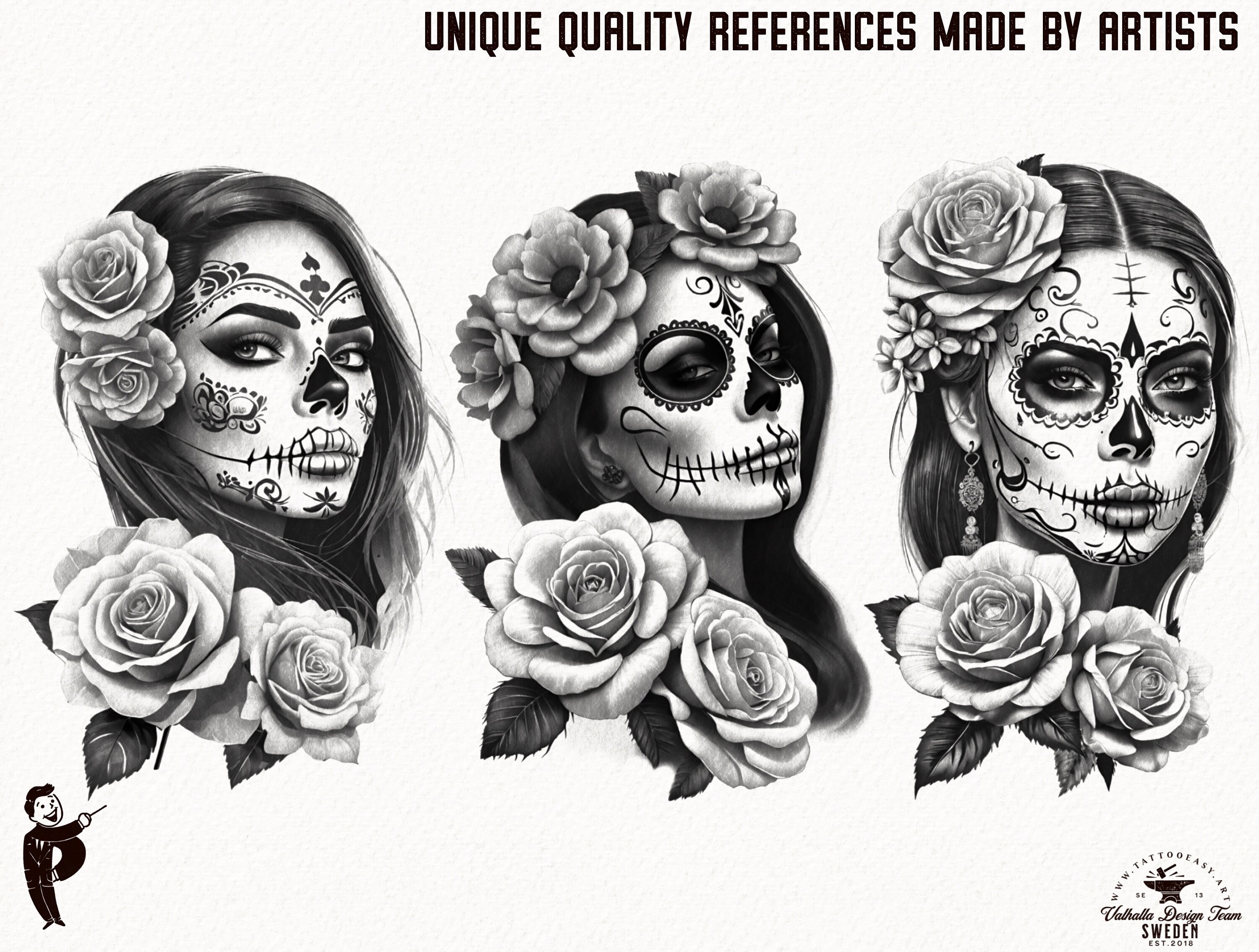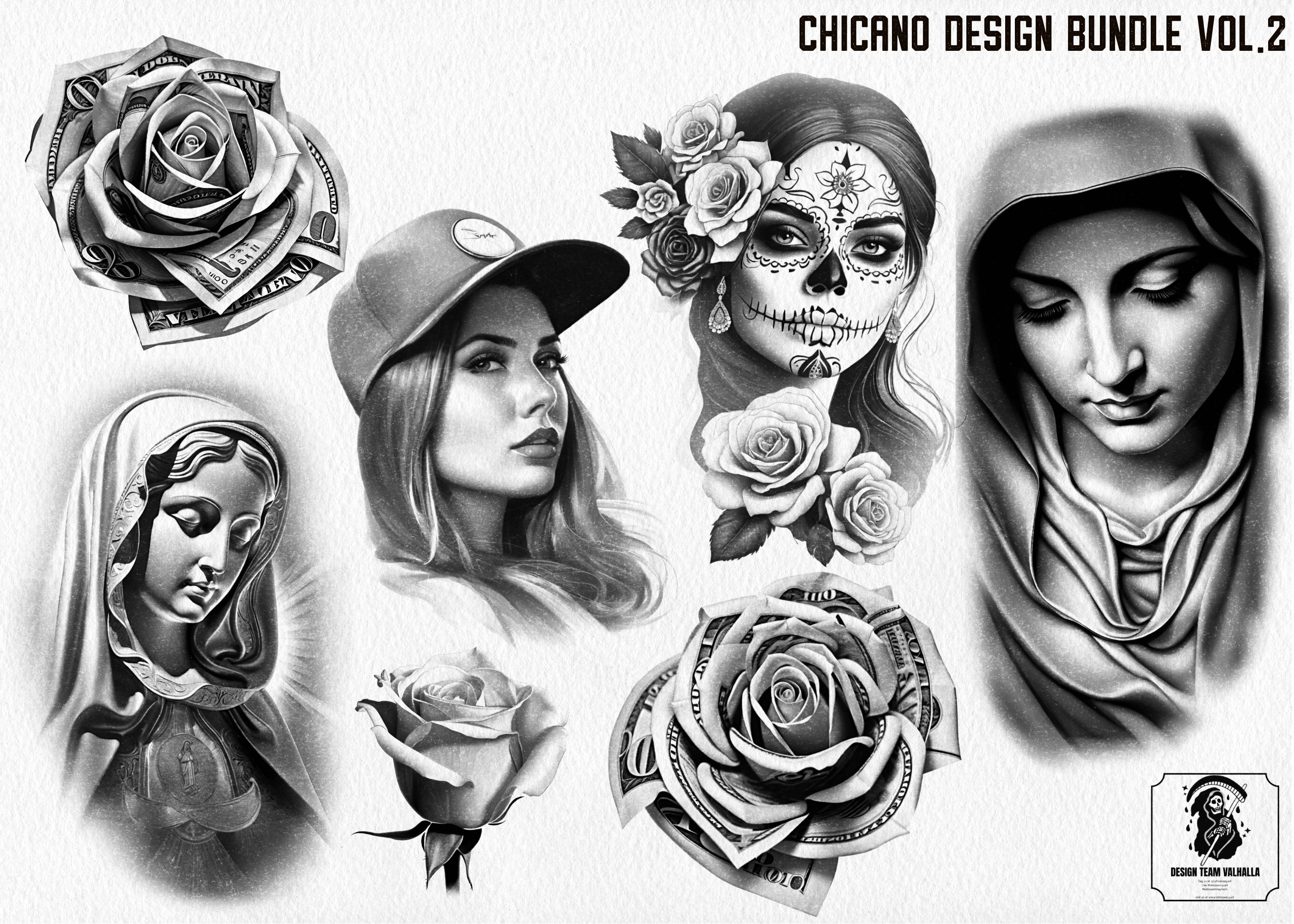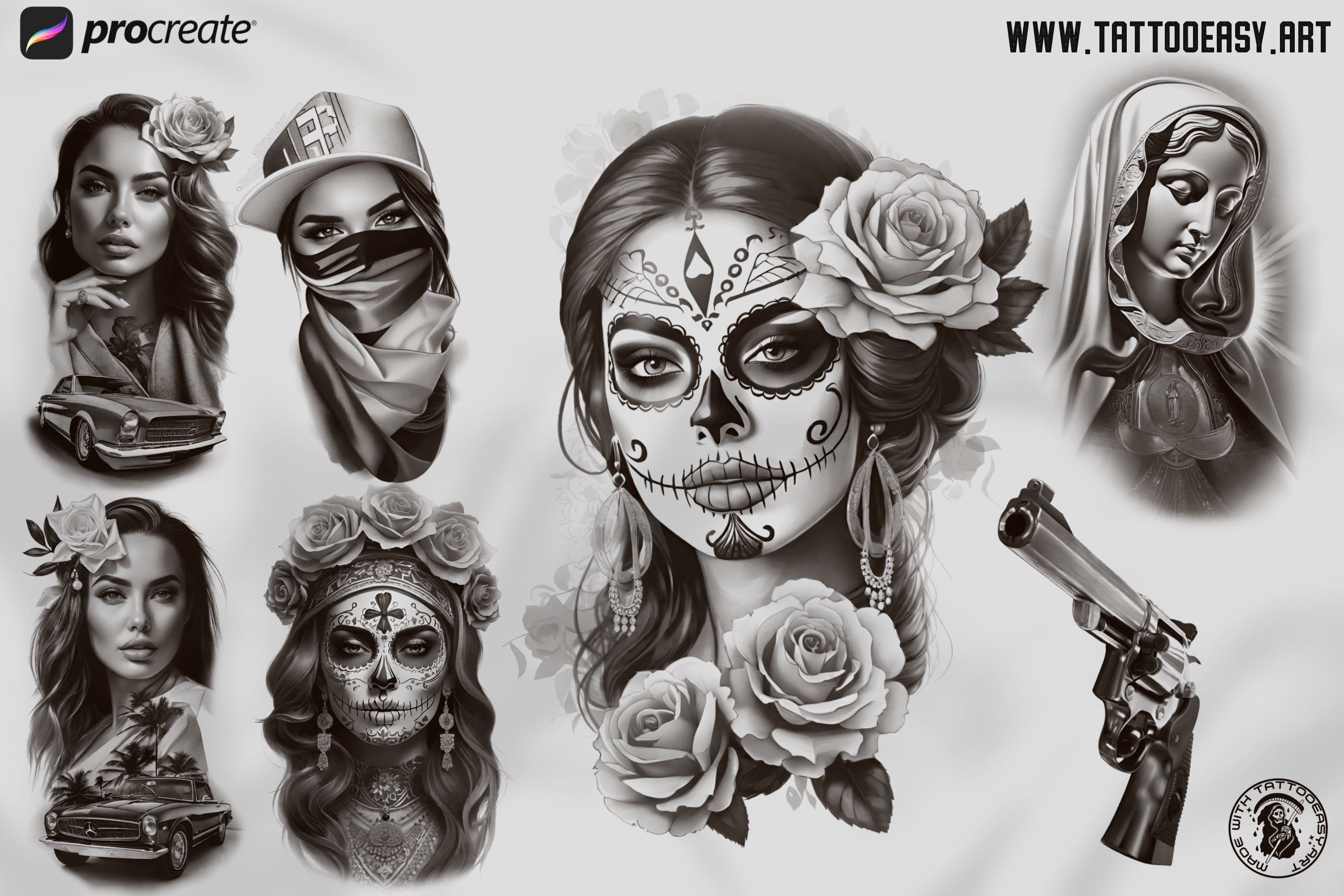 Chicas, La catrina, religious, dollar roses, guns, girls and cars & lots more