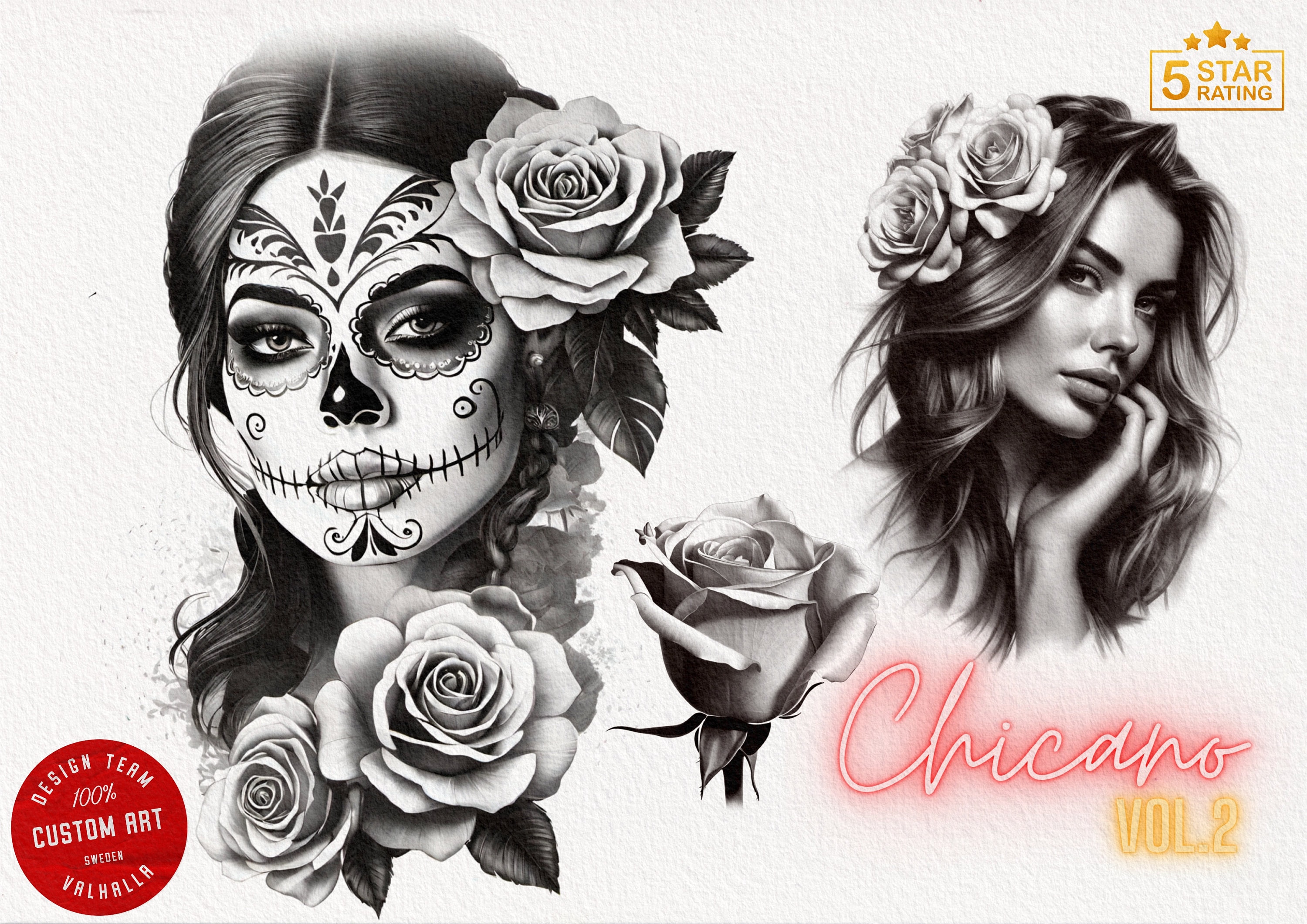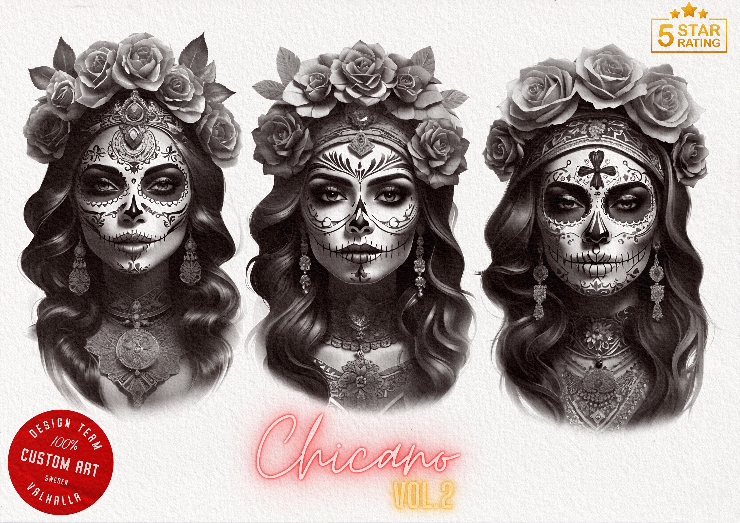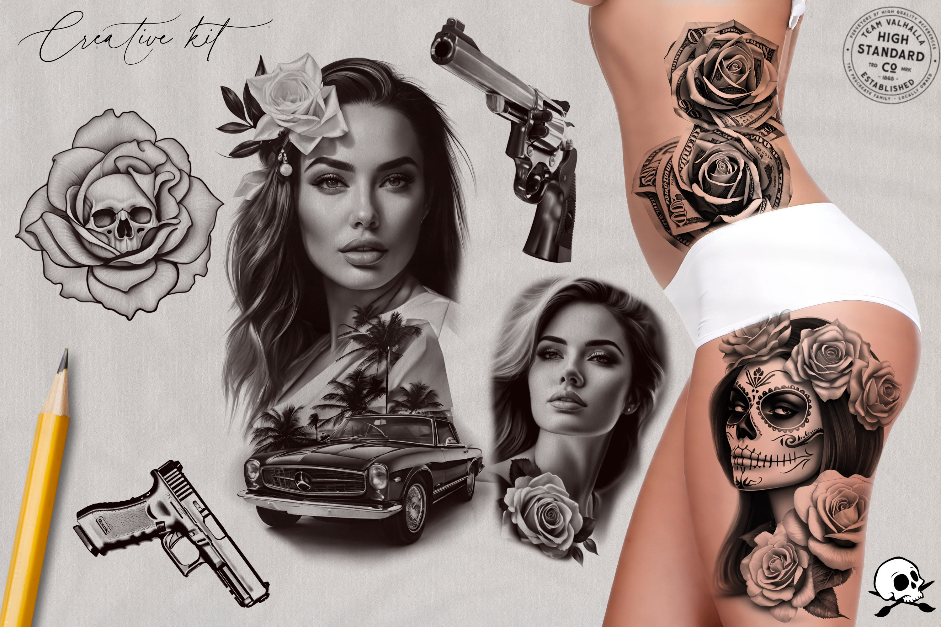 Chicas, La catrina, religious, dollar roses, guns, girls and cars & lots more