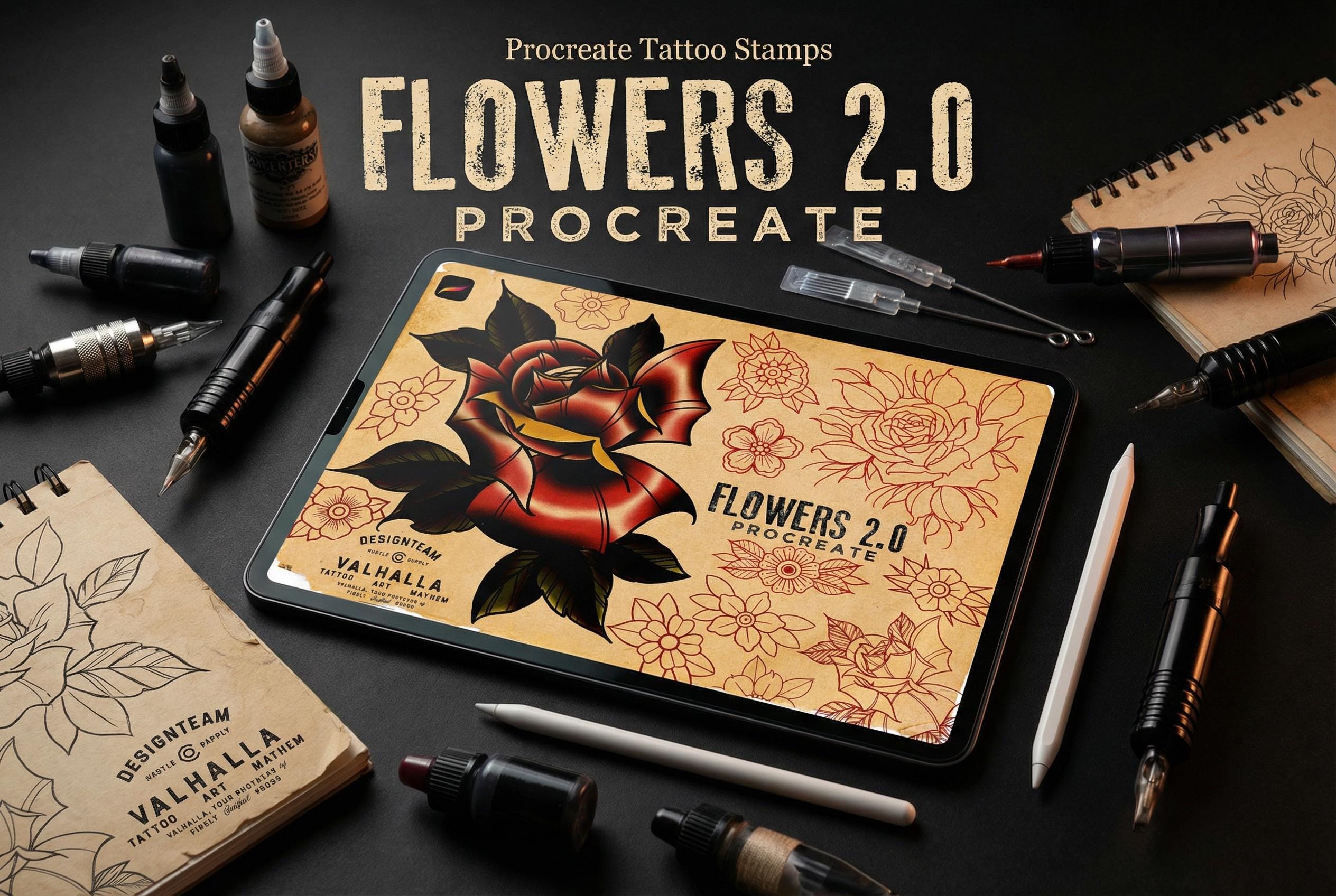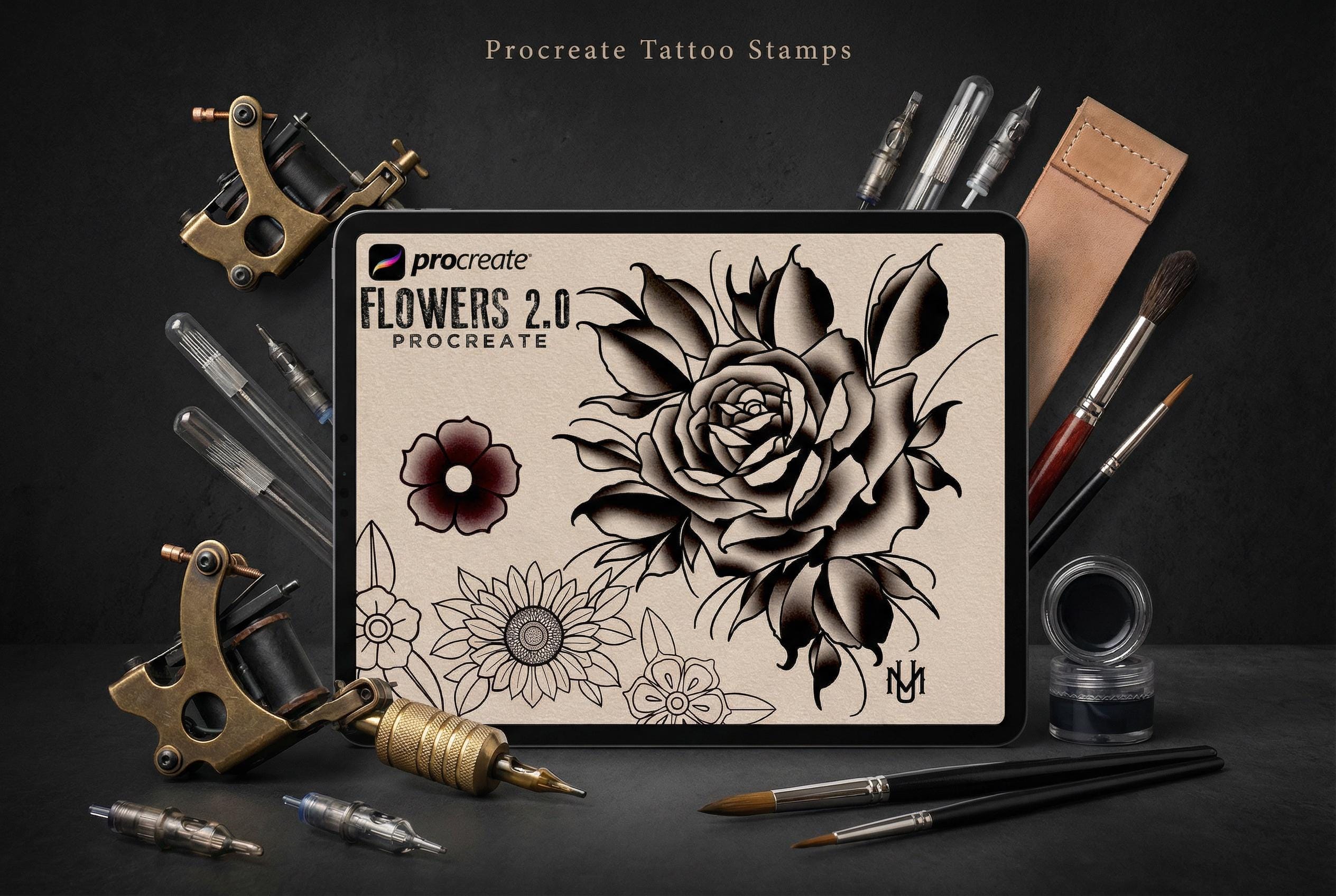 80+ outlined and some shaded tattoo flowers. Handmade custom stamps drawn to smooth your work flow and make things easier. Drawn by tattoo artist Mårten @staysick, hope that you will like them. Pls respect the artist & do not resell or give away our stamp references or brushes, but you can use them in your designs and tattos as much as you like ❤️📂🌸