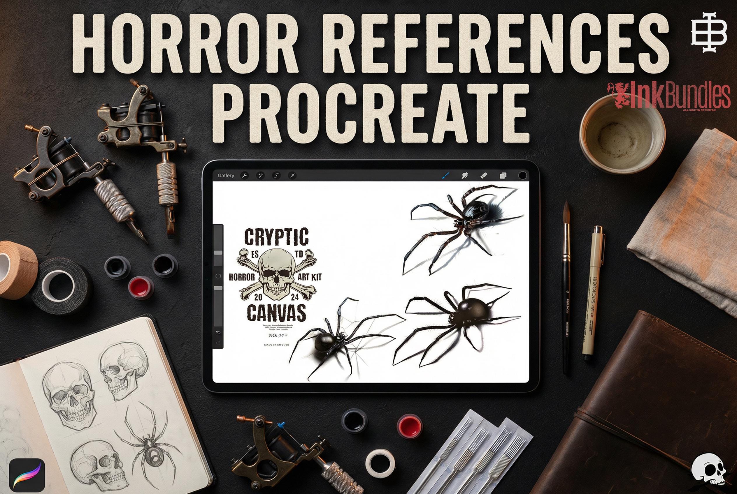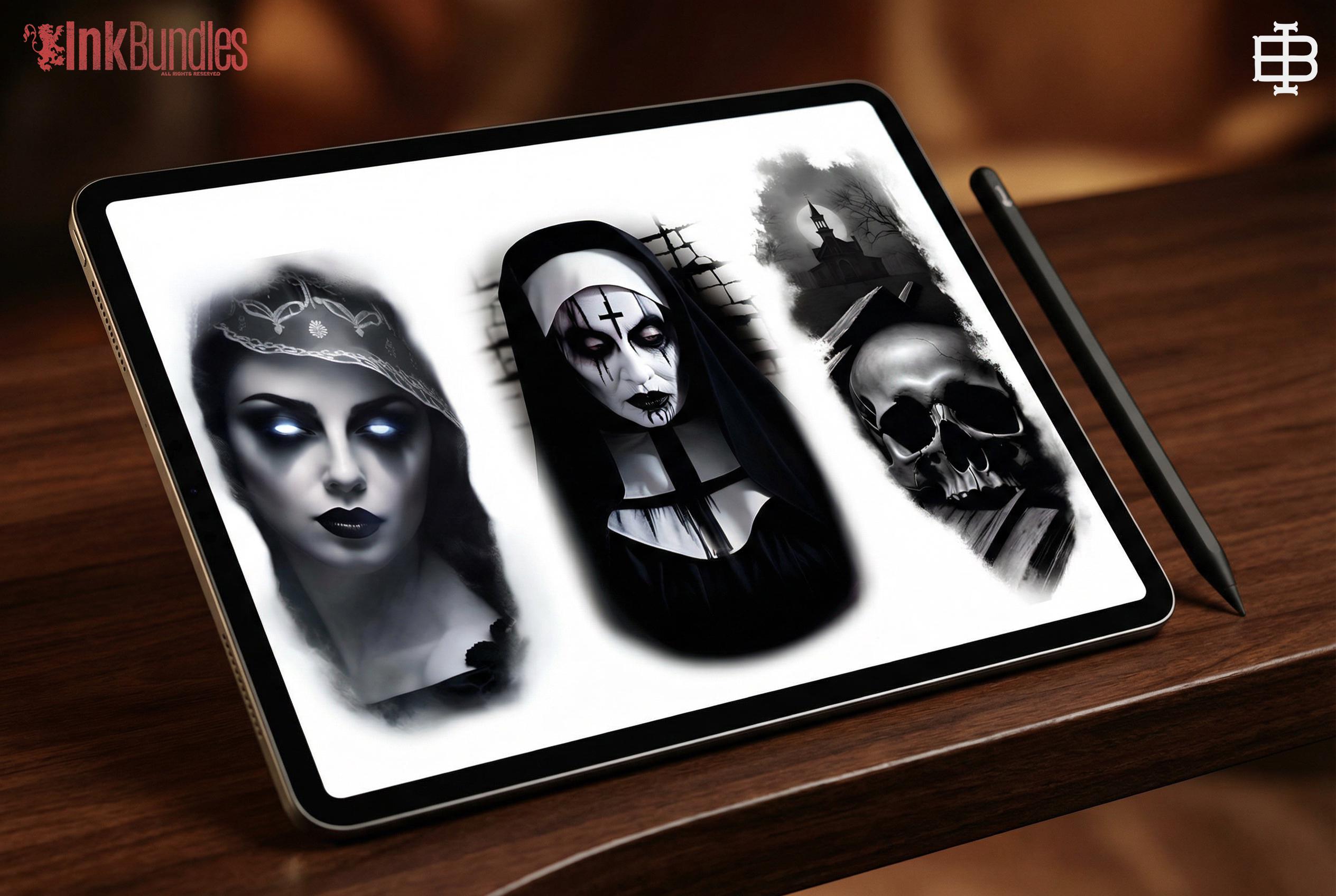 ~120 stamps for Procreate, 80 different horror inspired artworks ( skulls, undead, plague doctors, vampires, evil nuns, reapers, demonic ladies, mythological and movie characters ) + some background / design elements / 100% custom made unique art made by Design Team Valhalla