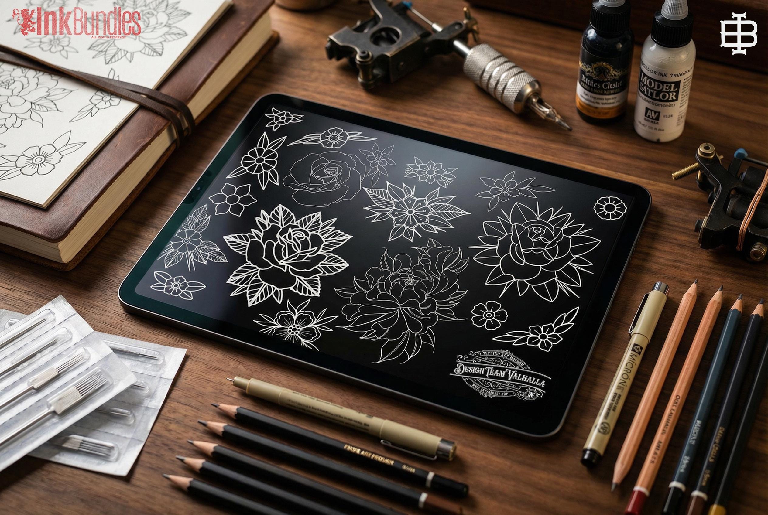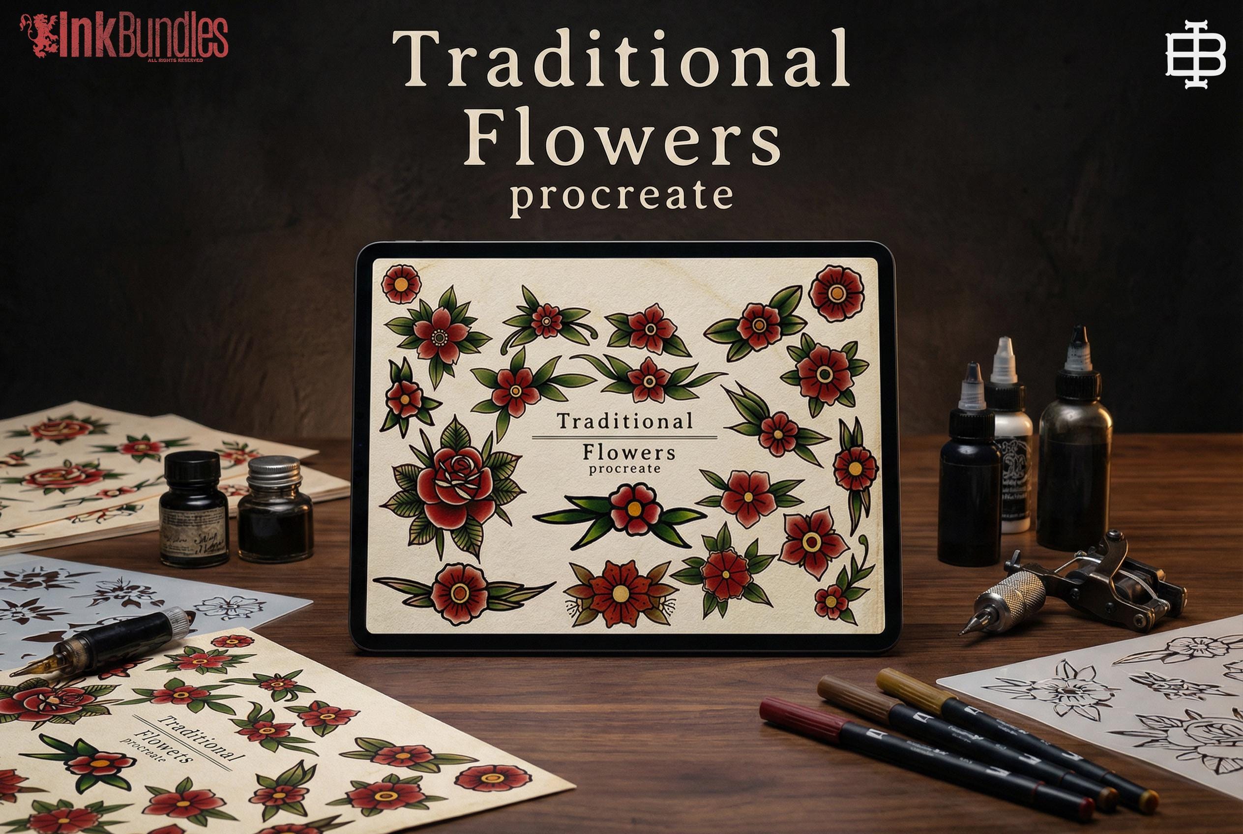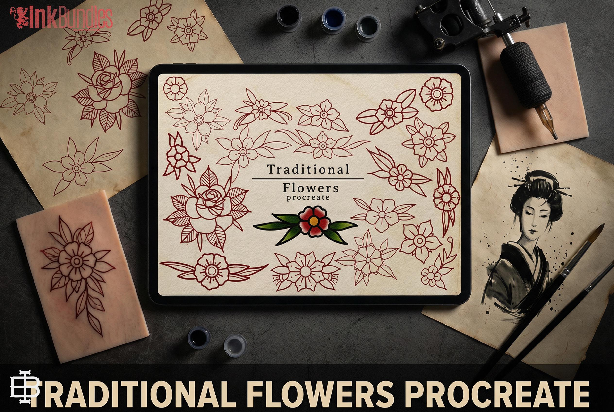 100 tattoo inspired flowers drawn by hand - .svg .png .ai & Procreate format included