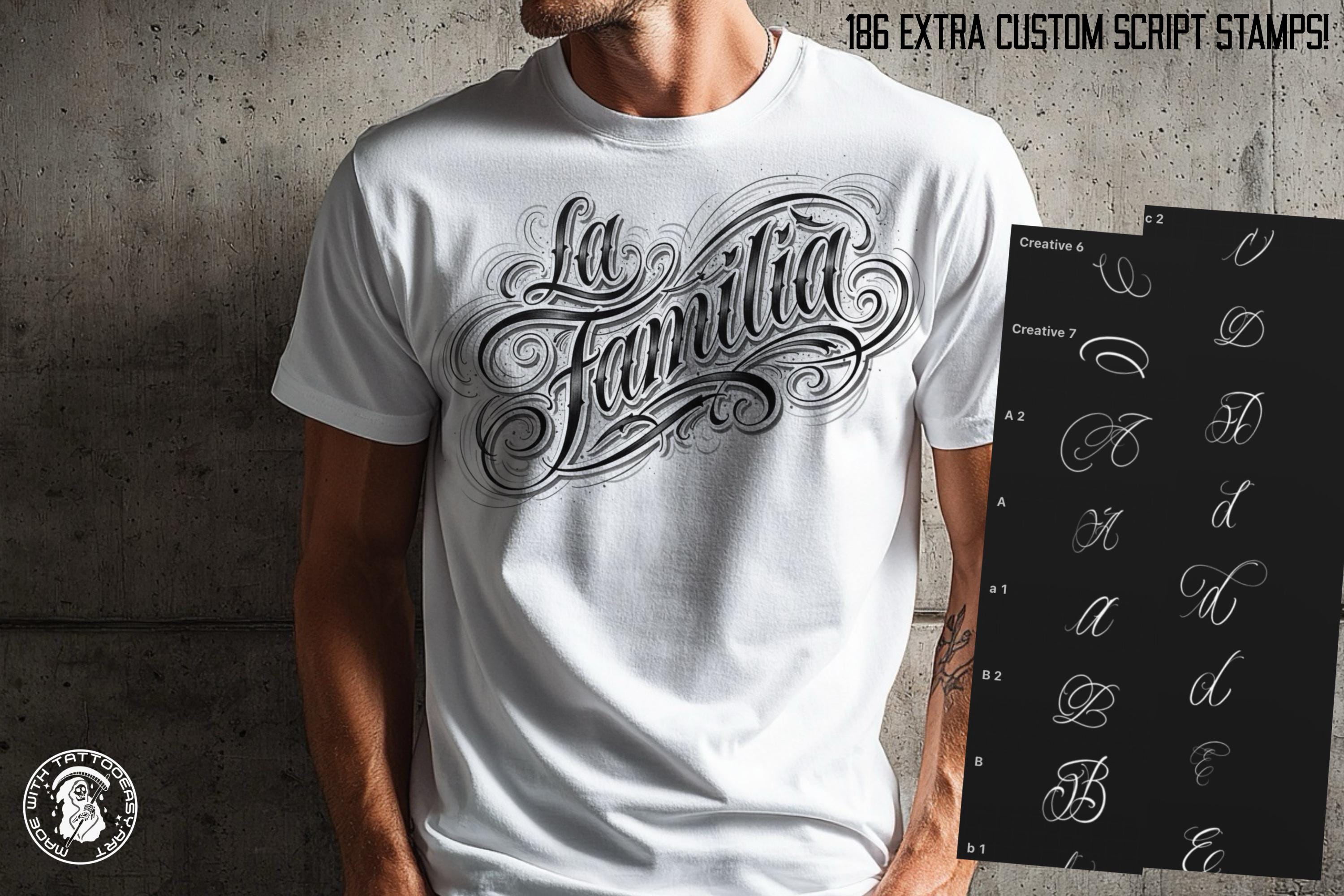 Elegant script inspired by “ Edwardian “ penmanship letters with some modern / chicano twist for a more modern look. Perfect for card design, fine tattoo lettering and even logo design! 130+ stamps with alphabet, ligatures, alternatives and swashes built for an endless source of creative alternatives for your design!