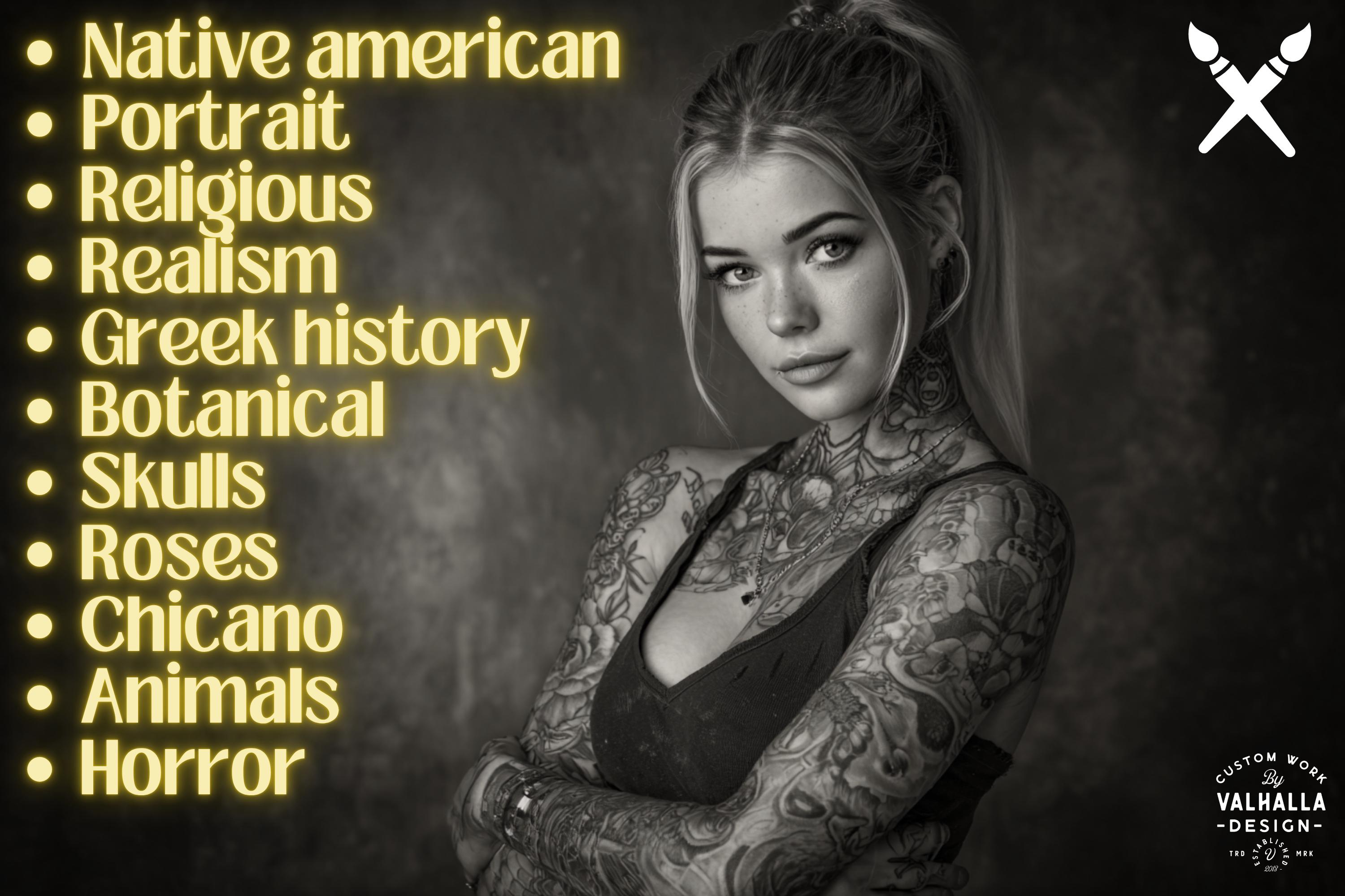 Chicano Black & Grey and Biomech Designs: Rich, detailed styles perfect for complex tattoos.