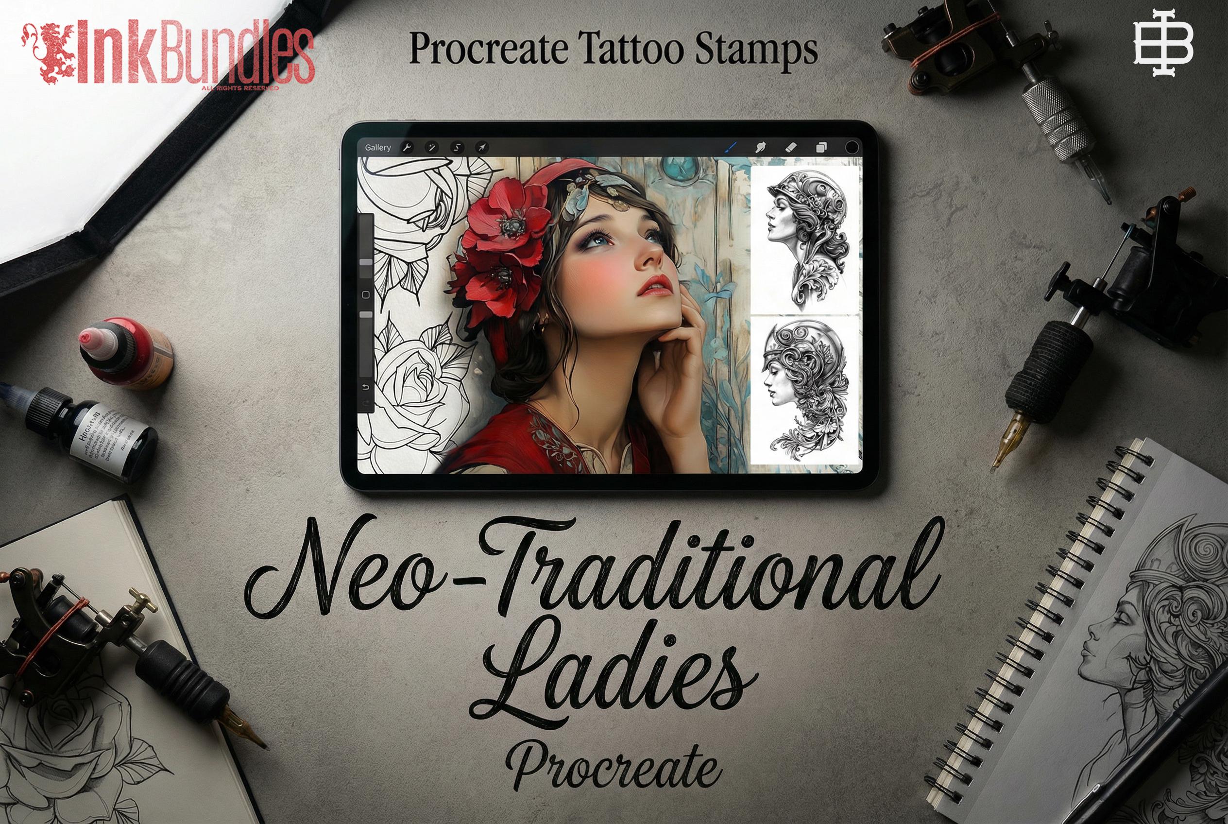 Neo-Traditional Lady Tattoo Design Kit: 2000+ Procreate Stamps, SVG & PNG Files