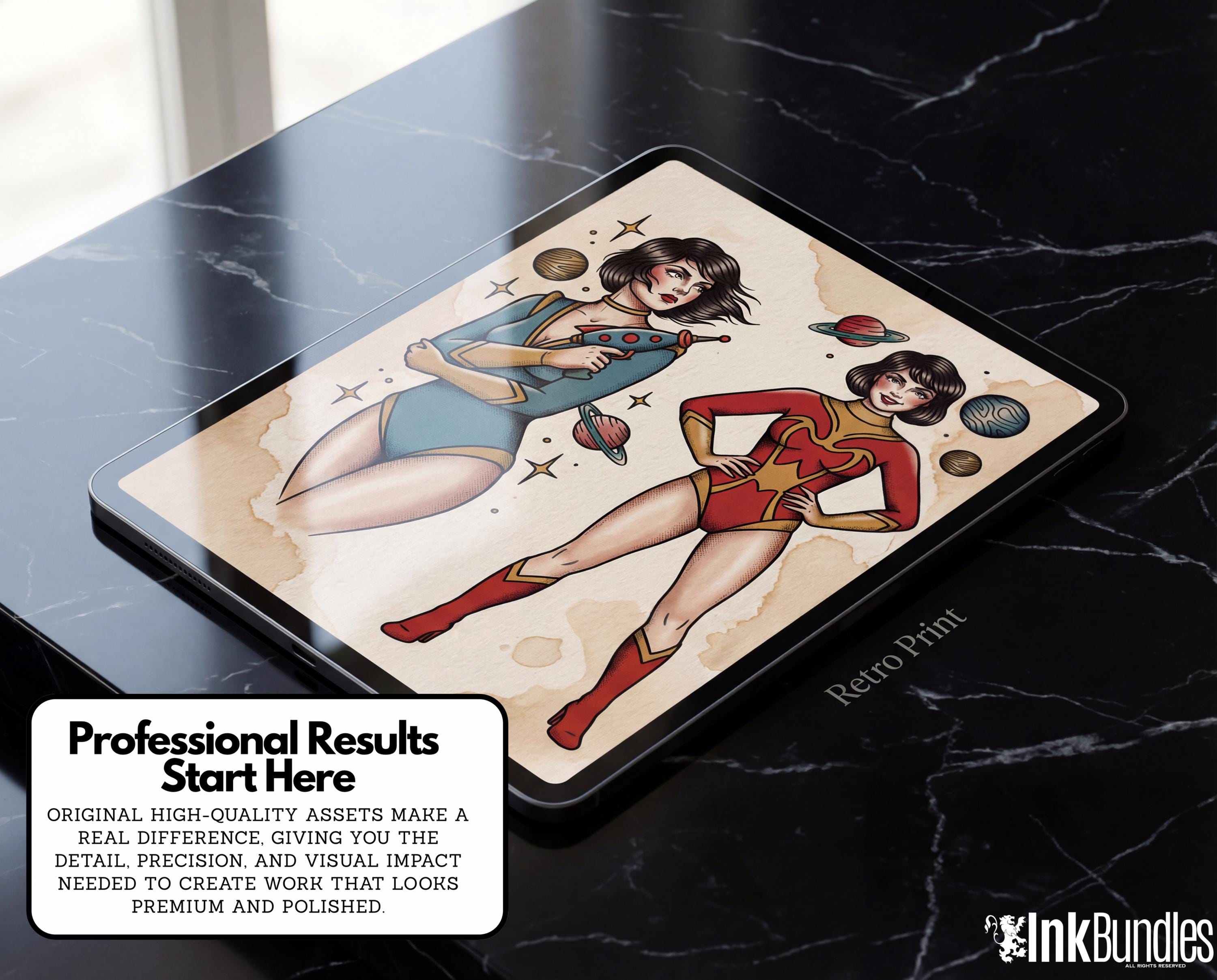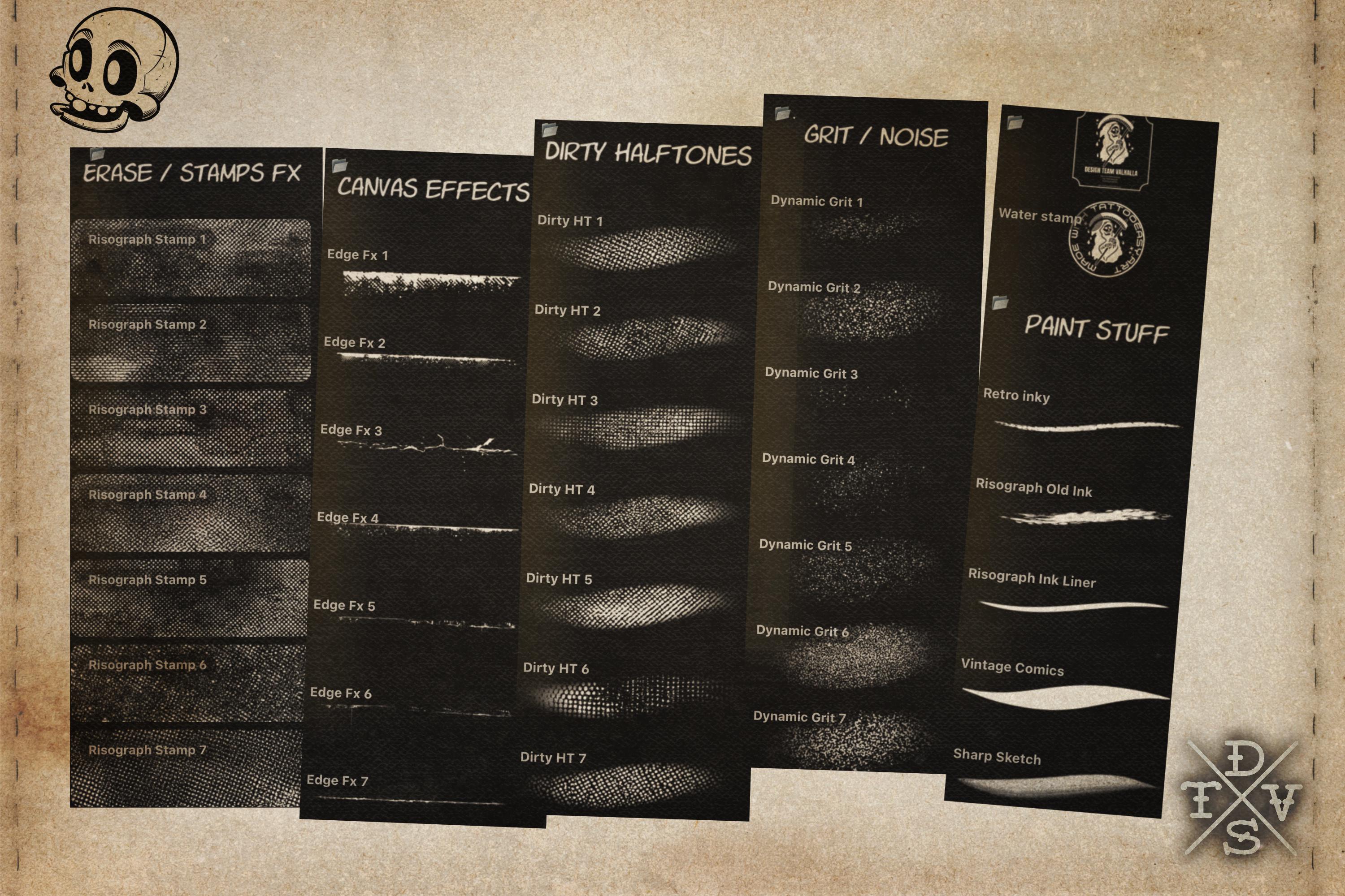 Inside, you’ll find over 550 custom-crafted brushes—from inky liners to gritty halftones—each designed to give your digital art that warm, imperfect character of traditional printmaking. We’ve also included 25 high-resolution retro paper scans, sourced from authentic factory prints and aged vintage sheets, plus risograph-inspired overlays and a variety of paper textures for endless experimentation.