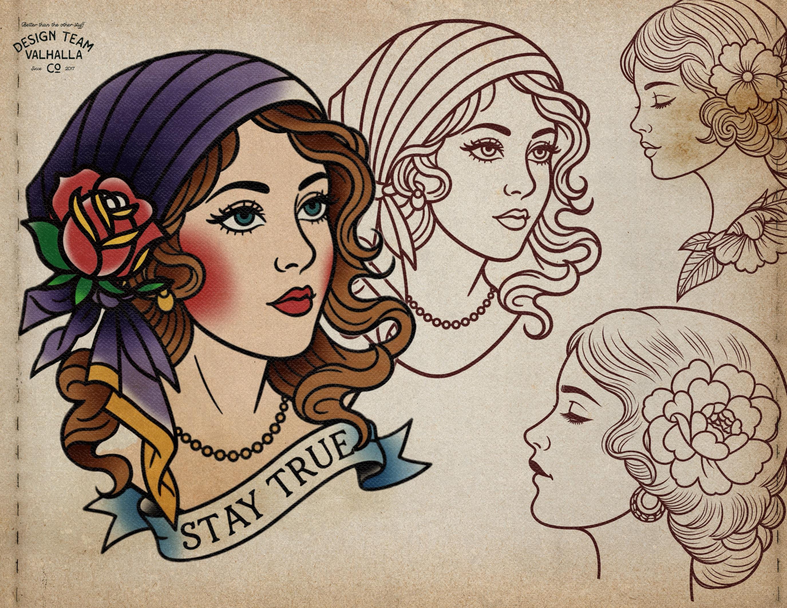 Traditional Tattoo ladies 30 designs – Procreate Stamps | Old School Clipart, lady templates