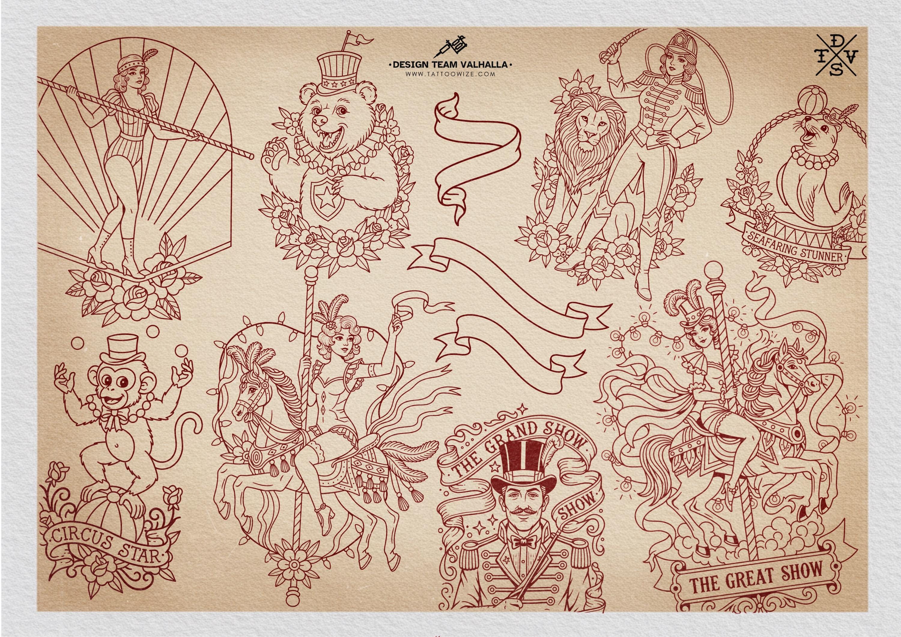 Unveil our Circus bundle filled with 100+ unique traditional circus tattoo stencils crafted under 2024-2025, each one sharply out-lined, crisp, and clean, designed with true craftsmanship. The designs are created by Design Team Valhalla – Sweden, using our signature clean-edge technology for flawless lines, perfect stamps, and professional results.