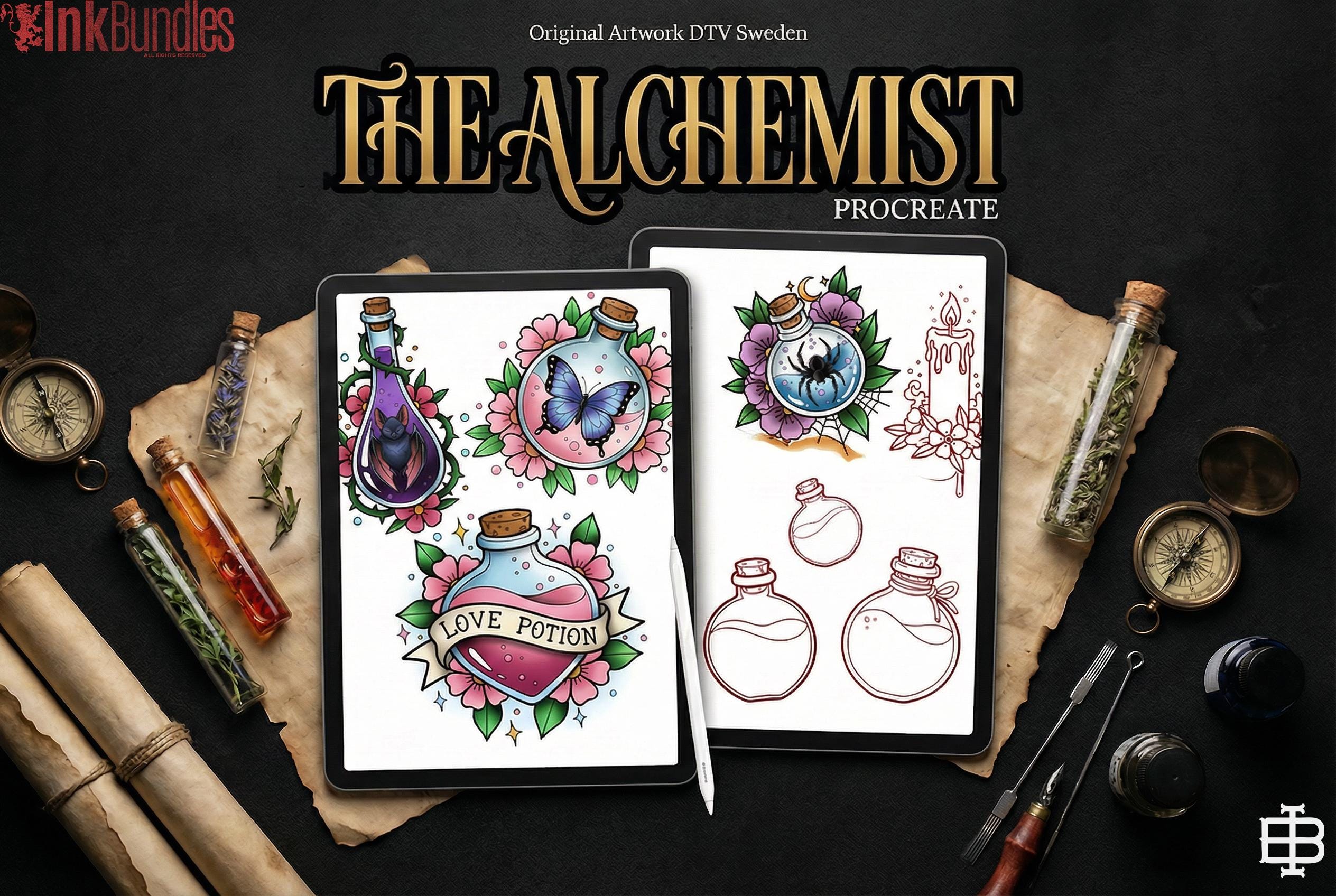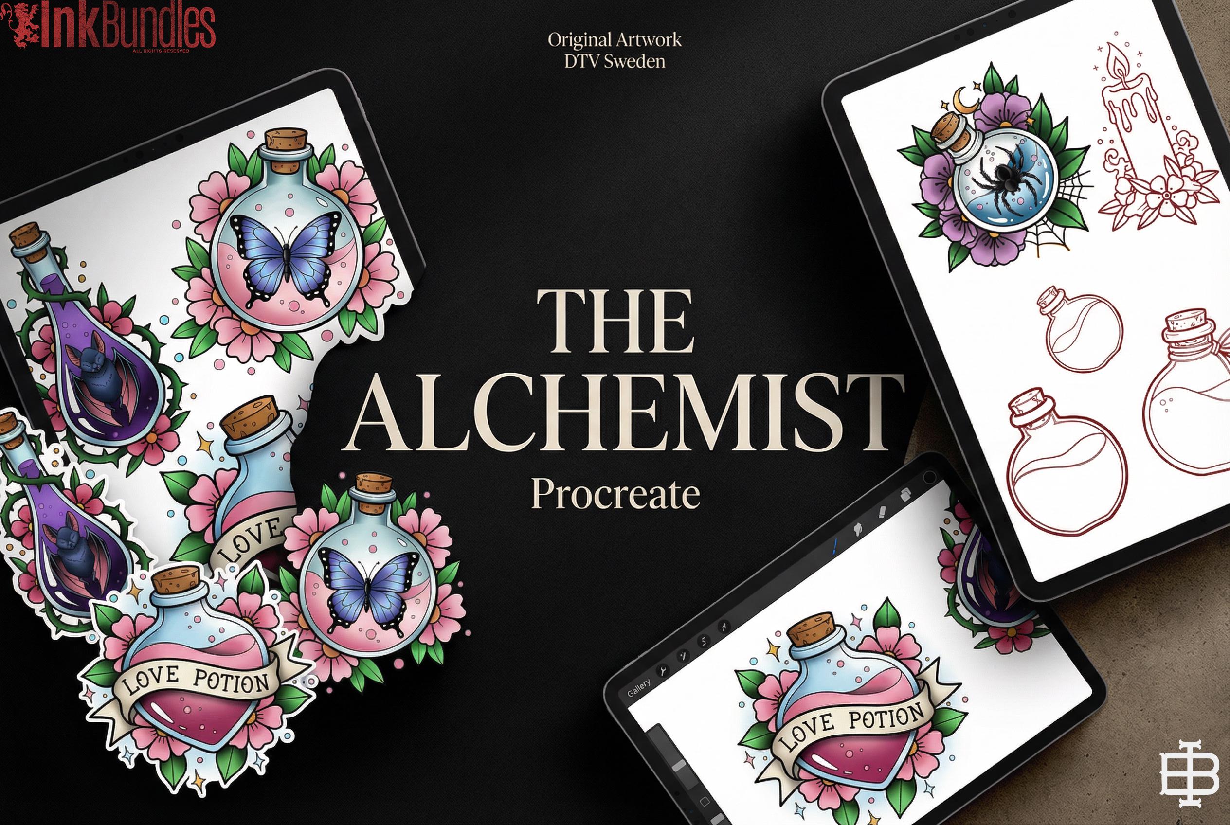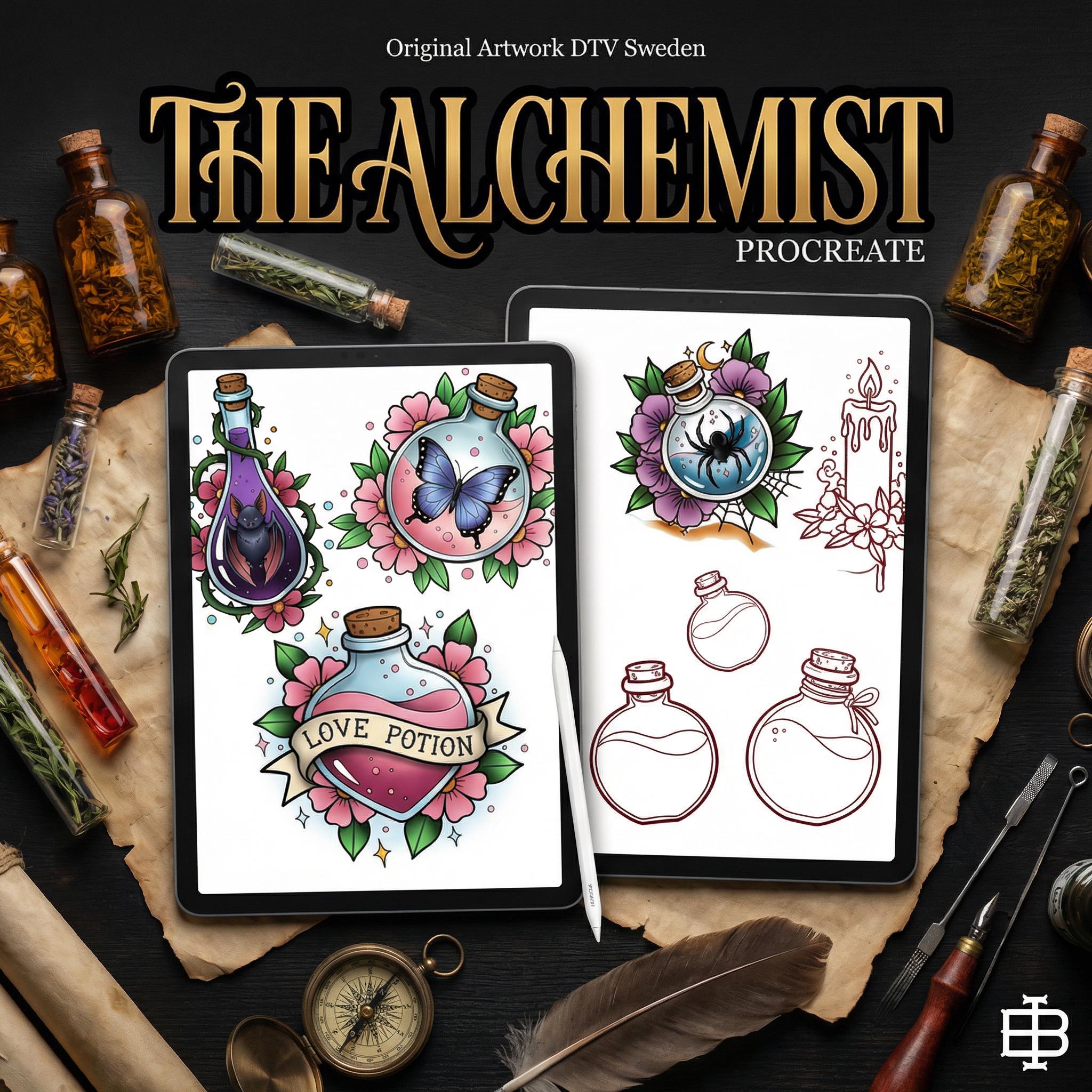 The Alchemist is a bundle for the creatives lookng for some fun, unique assets inspired by alchemy & witchcraft. Filled with cursed potions, magical brews and even the famous panther perfume that is guaranteed to work 60% of the time very time! You will also find some bubble brushes, frogs, bats and much more in this one of a kind Procreate experience.