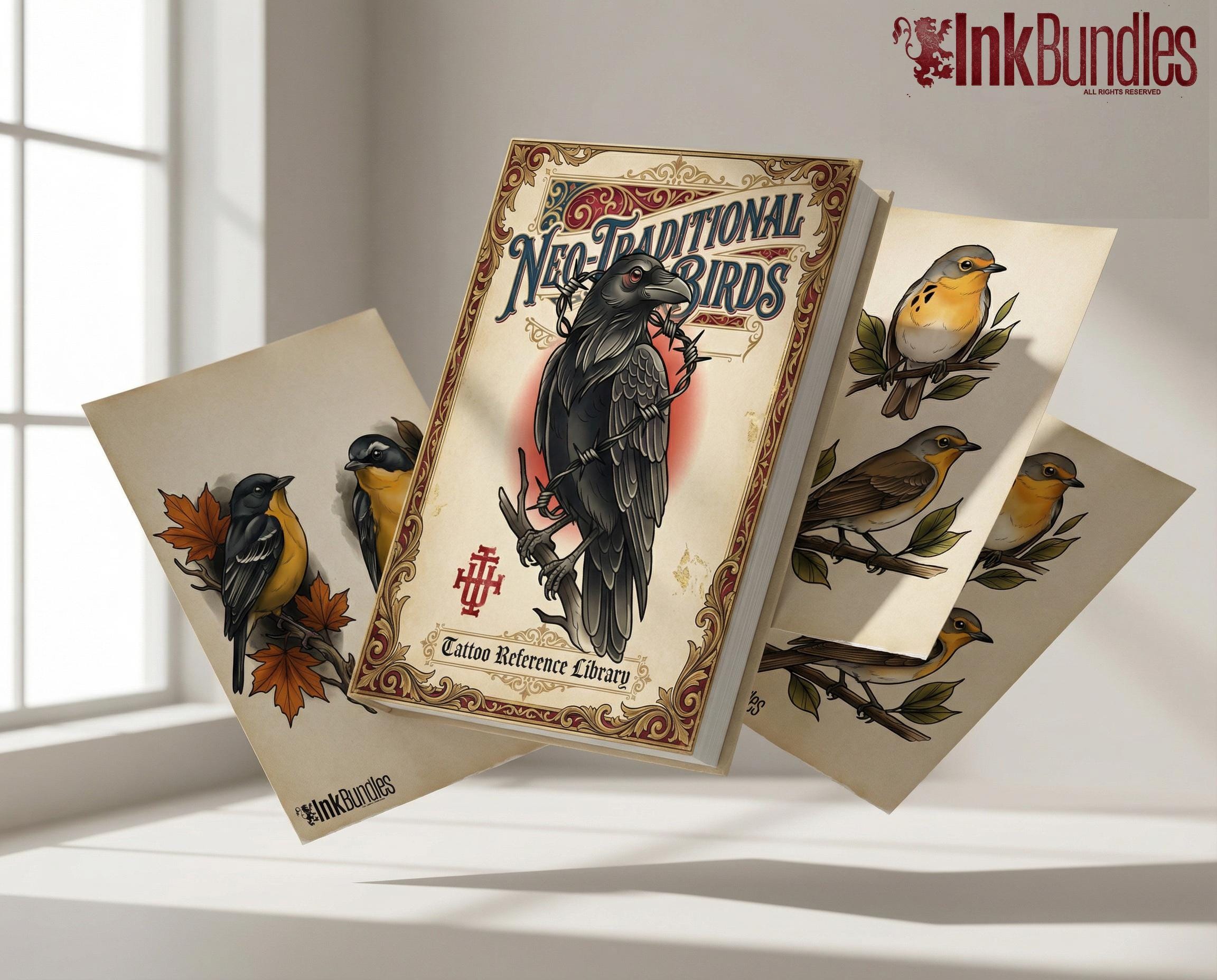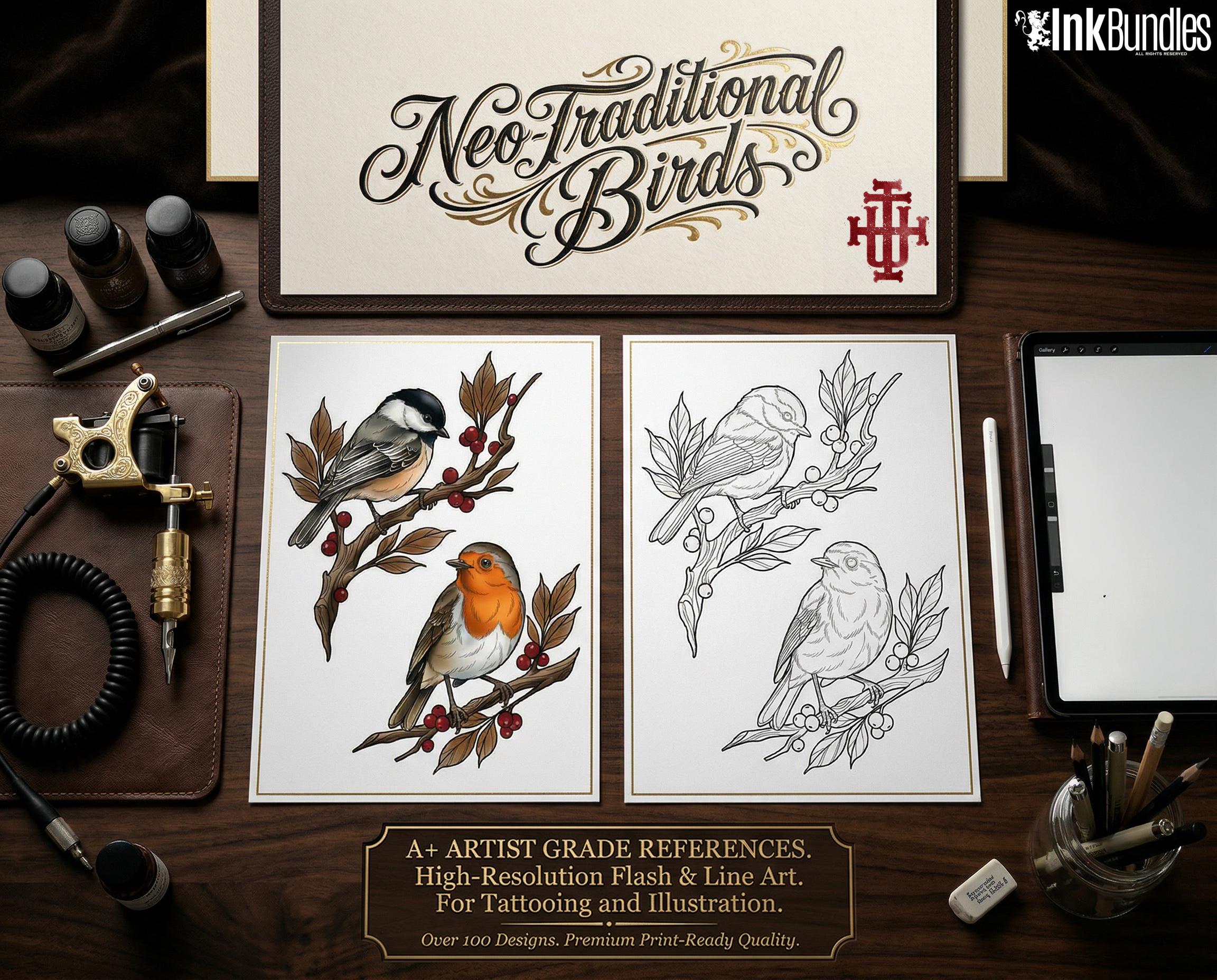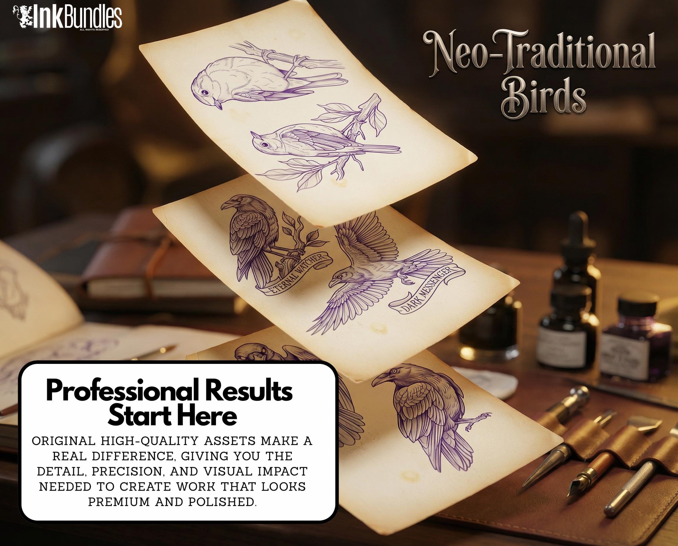 Neo Traditional Birds Tattoo Reference Kit, Procreate Stamps + PNG, 100+ Original Designs
