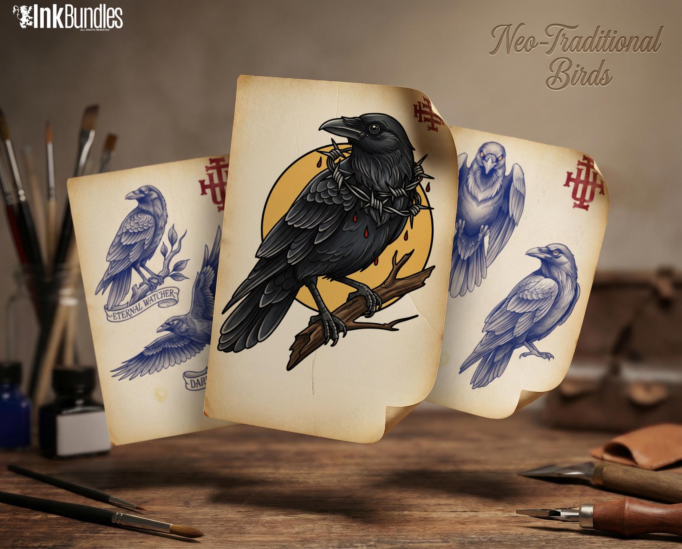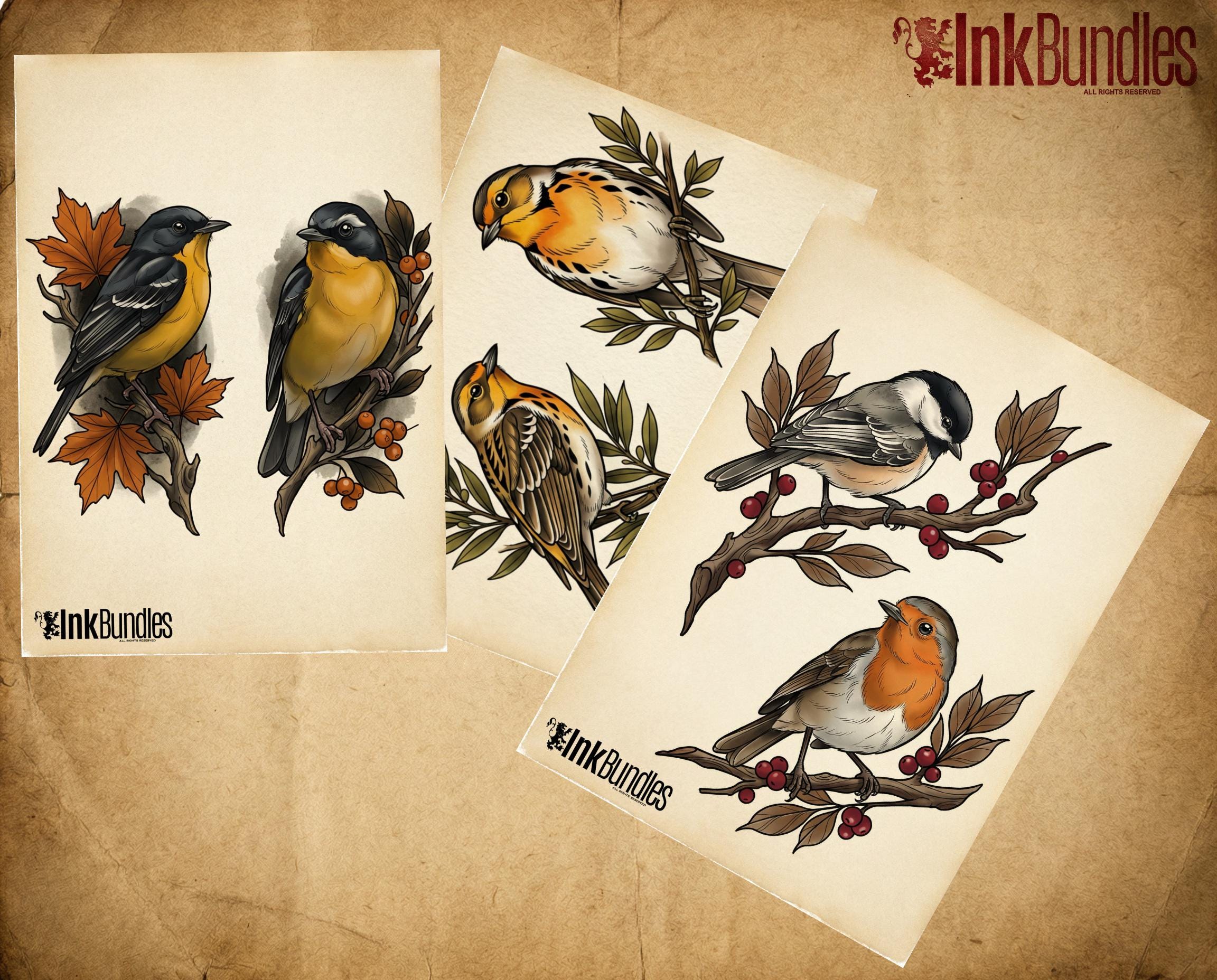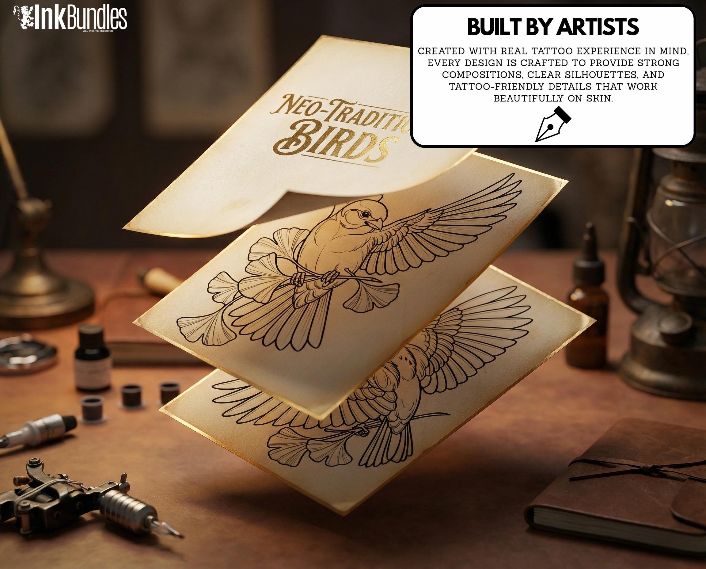 Style keywords Neo-traditional birds, bold readable forms, stencil-ready linework, flash-friendly composition building.