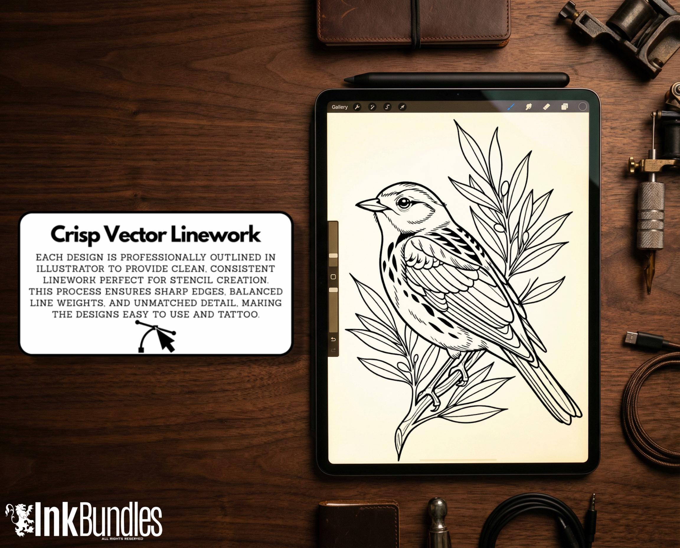 You’ll receive 100+ unique clean bird stencil designs that are easy to stamp into Procreate, modify, recompose into flash sheets, and refine into your own final tattoo artwork. PNG files are included for flexible use in other programs and design pipelines.