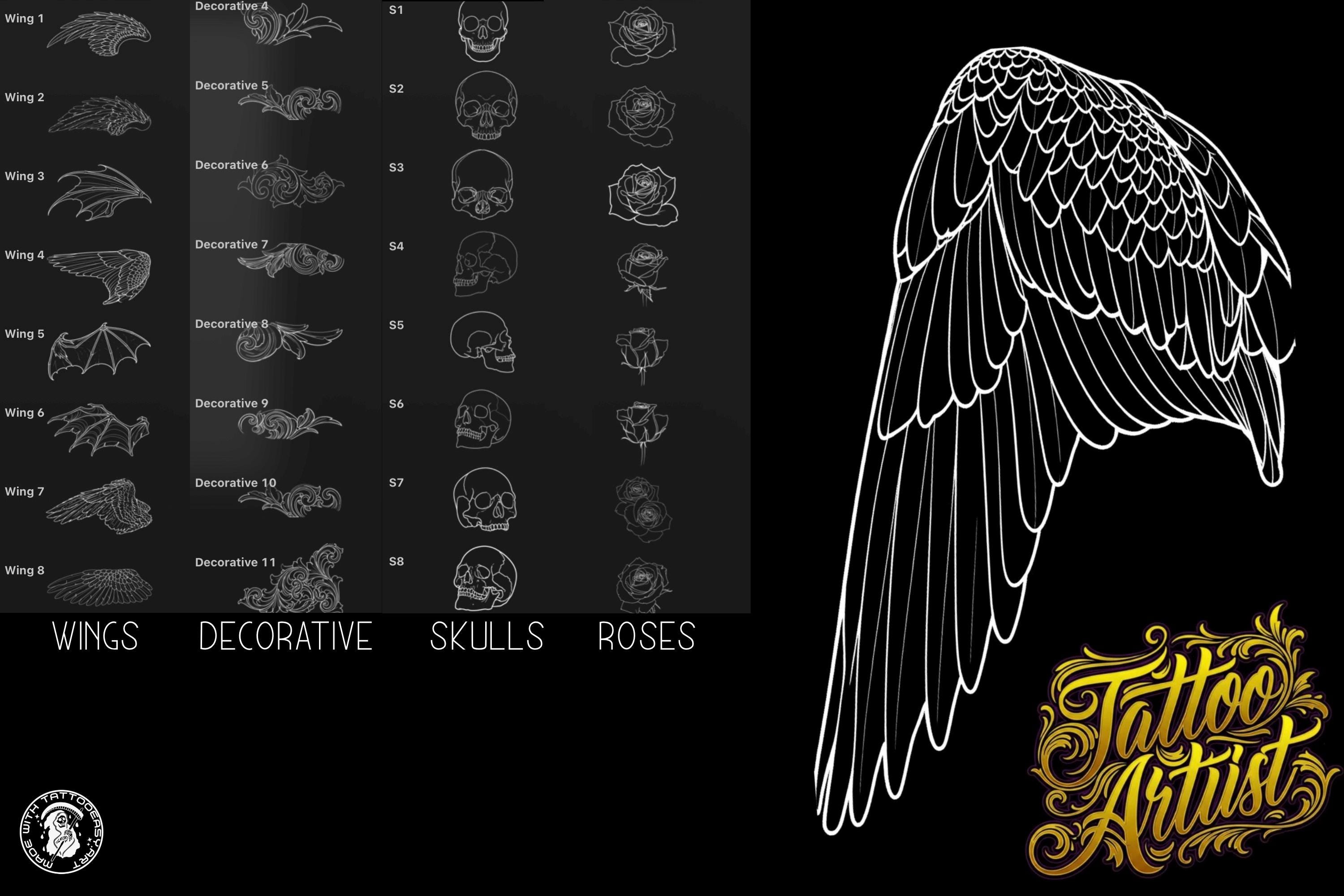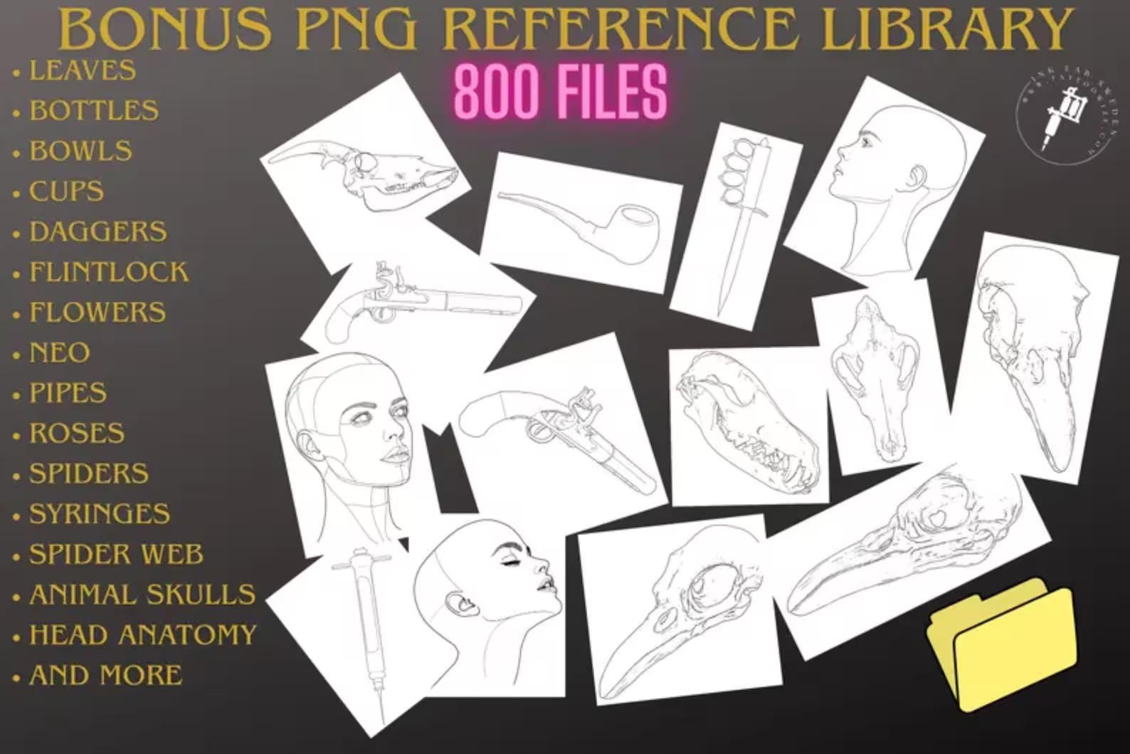 With high-quality references, easy-to-use templates, 300 dpi paper scans - ready made canvases, tattoo needle brushes, shaders, liners, 19 3d models, mixed in a variety of styles and themes, our collection provides endless inspiration and guidance for your creative process.