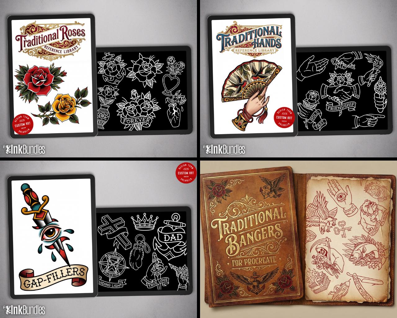 Traditional Tattoo Procreate Stamps, custom art, 1100+ unique designs (PNG + Brushset)